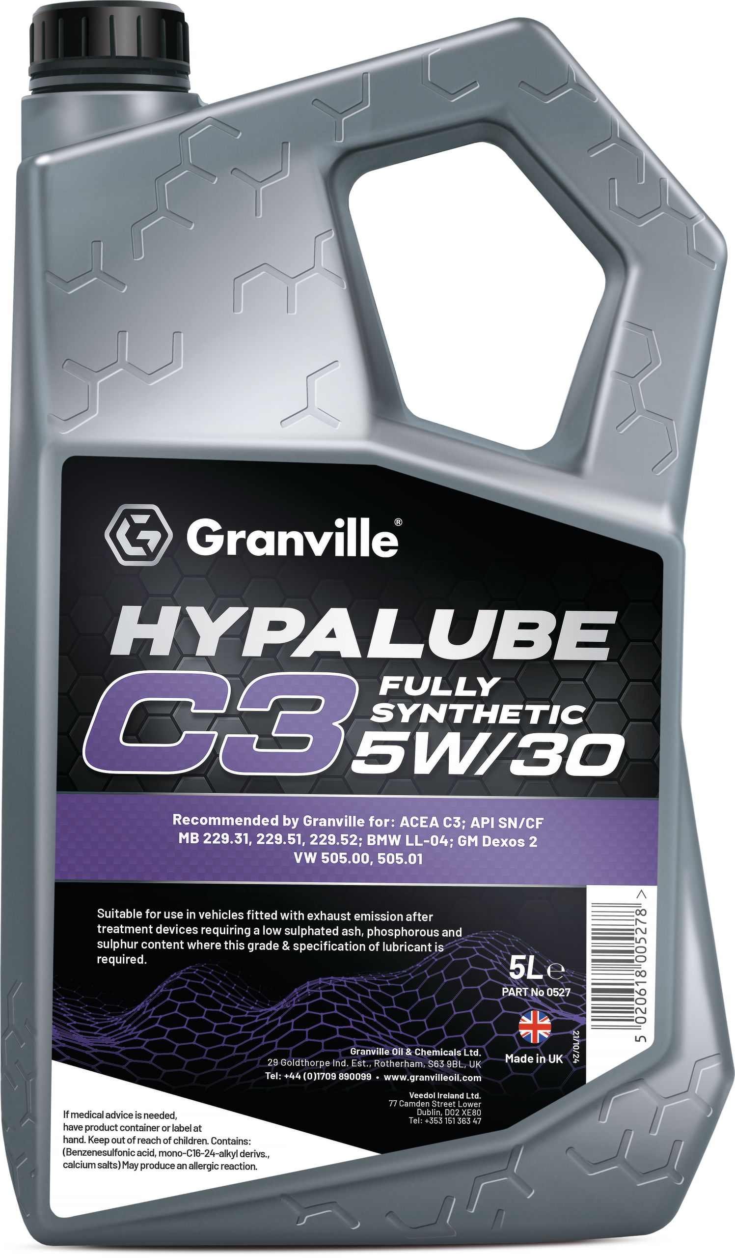 Granville Hypalube C3 fully synthetic engine oil has been specially formulated to meet the requirements of a Low SAPS (Sulphated Ash, Phosphorus and Sulphur) engine oil. Hypalube C3 is suitable for use in vehicles fitted with exhaust after treatment devices that recommend a lubricant of the grade and specification
